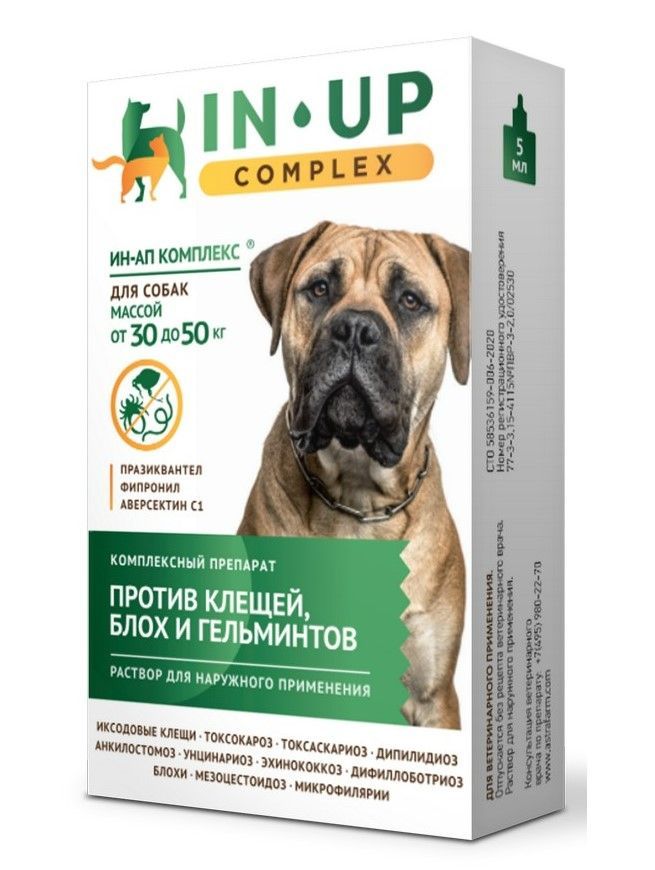 IN-UP COMPLEX – лечебно-профилактическое антипаразитарное средство, обладающее комплексной инсектоакарицидной и антигельминтной активностью против личиночных и половозрелых фаз развития эктопаразитов (блох, иксодовых клещей, вшей, власоедов) и эндопаразитов (круглых и ленточных гельминтов), паразитирующих у собак.