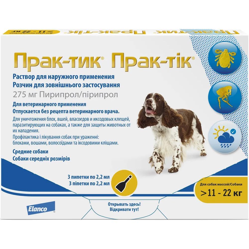 Прак- тик. Раствор для капельного нанесения на кожу для собак массой от 11 до 22 кг. Инсектоакарицидный лекарственный препарат, предназначенный для борьбы с насекомыми и иксодовыми клещами, паразитирующими на собаках, а также защиты животных от их нападения.