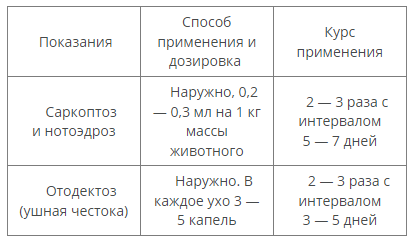 Дозировка и применение: животных с обширными участками поражения кожи обрабатывают в два приема с интервалом в 1 сутки, нанося препарат на пораженные участки сначала на одной, а затем на другой половине поверхности туловища.