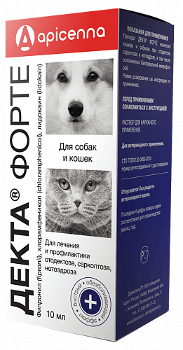 Препарат Декта Форте назначают кошкам и собакам при отодектозе, саркоптозе и нотоэдрозе, в том числе, осложненных бактериальной микрофлорой.