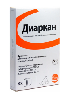Диаркан задают внутрь 2 раза в день (утром и вечером) в течение 5 дней в следующих дозах: кошкам и карликовым собакам (весом менее 5 кг) — 0,5 кубика на прием, маленьким собакам (весом от 5 до 15 кг) — 1 кубик на прием, средним собакам (весом от 15 до 30 кг) — 1,5 кубика на прием, крупным собакам (весом более 30 кг) — 2 кубика на прием. Сахарный кубик скармливают с руки хозяина, добавляют в корм или в воду.