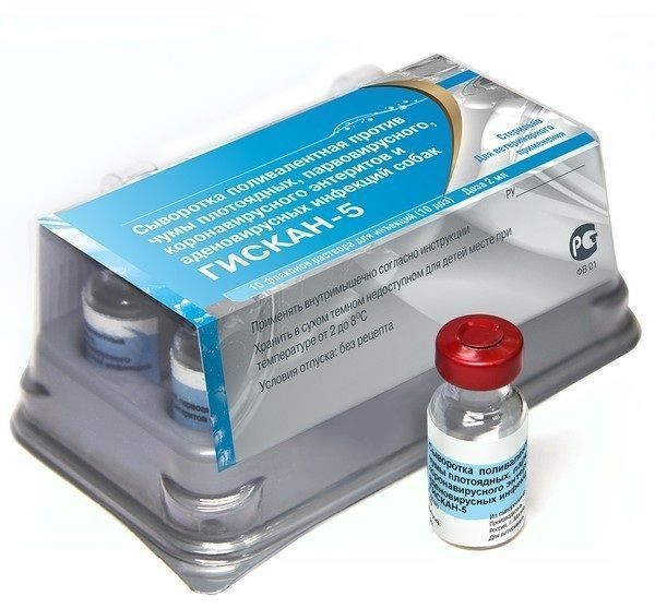 Гискан- 5. Сыворотка поливалентная против чумы плотоядных, парвовирусного, коронавирусного энтеритов и аденовирусных инфекций собак.