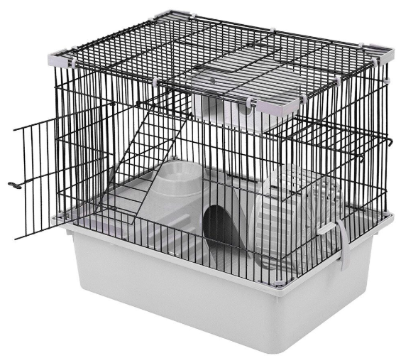 Клетка для грызунов металлическая на пластиковом поддоне. Разборная конструкция - 4 стенки и крыша. В передней (длинной) стенке дверца. В комплекте: 1 пластиковый этаж, 1 мет.этаж с лестницей, 1 прямоугольный домик, колесо - 140мм, миска D100 - 70мл.