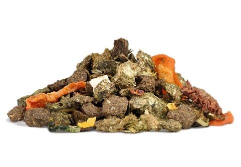Состав: луговые и горные травы, яблочные выжимки, мука из семян подсолнечника, семя льна, льняное масло, фруктоолигосахариды, сушеный огурец, сушеная морковь, сушеный сельдерей, сушеный цуккини, цветы календулы, цветы красного клевера, шишки хмеля, дрожжевой экстракт.
