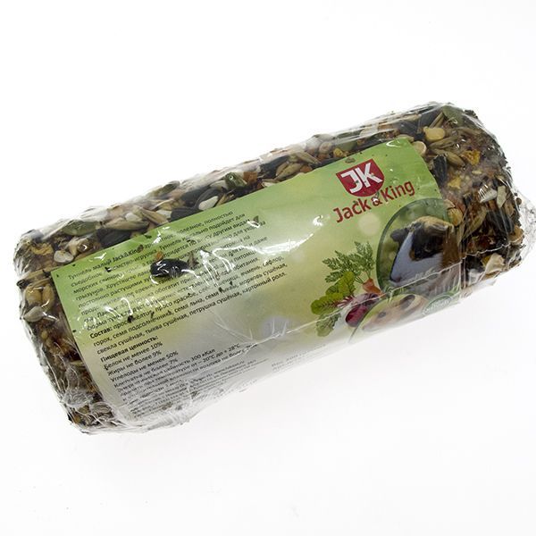 Состав: просо желтое, просо красное, овес, пшеница, ячмень, сафлор, горох, семя подсолнечника, семя льна, семя тыквы, морковь сушеная, свекла сушеная, тыква сушеная, петрушка сушеная, картонный ролл.