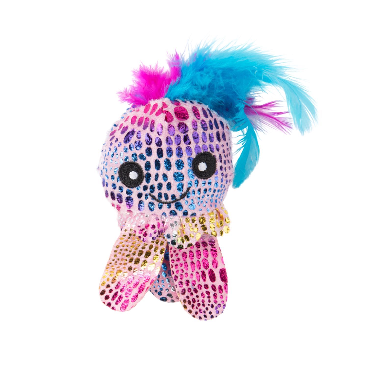 Игрушка для кошек Mr.Kranch Осьминожка плюшевая с кошачьей мятой и перышками 6,5 см розовая
