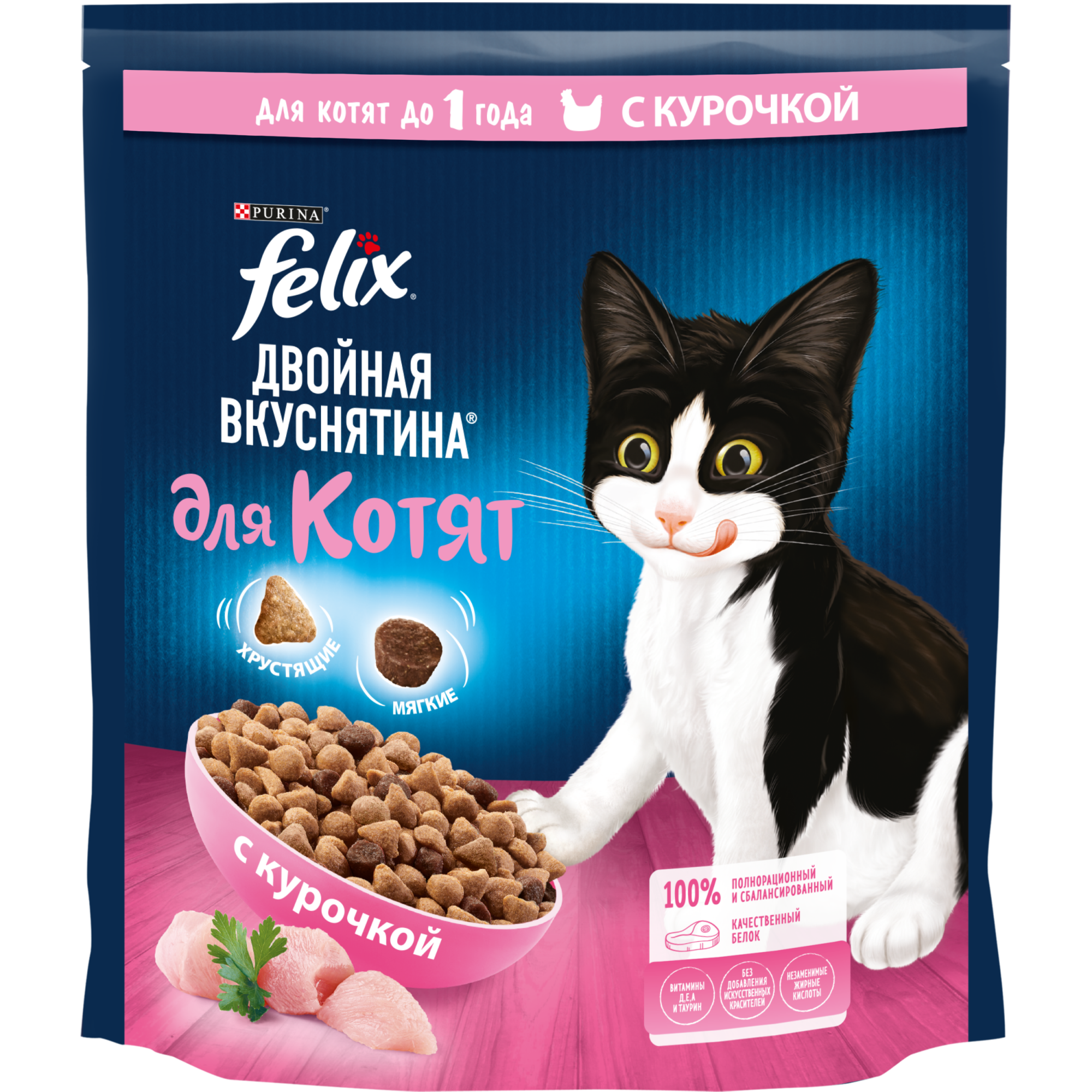 Рекомендации по кормлению: рекомендуем включить в рацион Вашего котенка корм Felix® Двойная вкуснятина® на 3-4 неделе жизни. Чтобы котенку было легче есть корм, добавьте в него немного воды. Увеличивайте количество корма, когда котенок начнет есть больше и сокращайте количество добавляемой в корм воды, когда он сможет есть сухой корм отдельно. Организм каждого котёнка индивидуален. Поэтому в зависимости от уровня активности и состояния здоровья котенка количество корма может отличаться. Также подходит для беременных и кормящих кошек. Следите, чтобы у Вашего котенка всегда была чистая свежая питьевая вода. Достаточное ежедневное потребление воды - обязательное условие здоровья Вашего котенка.
