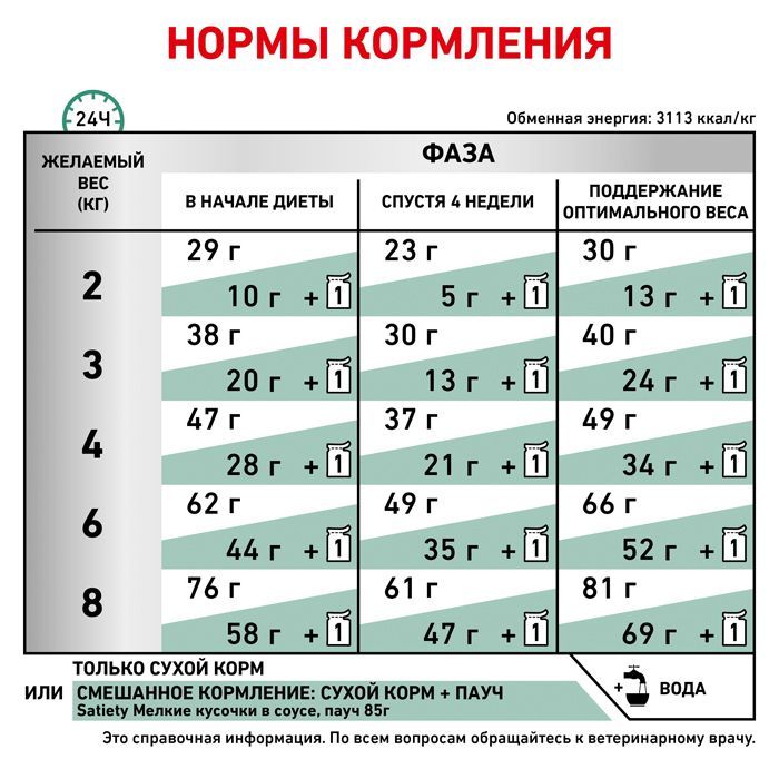 Рекомендации по кормлению: перед применением проконсультируйтесь с ветеринарным врачом. Используйте таблицу на упаковке для определения суточной нормы кормления вашей кошки. Указанные нормы рекомендованы для поддержания кошки в оптимальной физической форме. Суточное количество корма может быть разделено на два и более кормлений. Для достижения оптимального состояния животного может потребоваться изменение рациона. Всегда оставляйте постоянный доступ к чистой питьевой воде.
