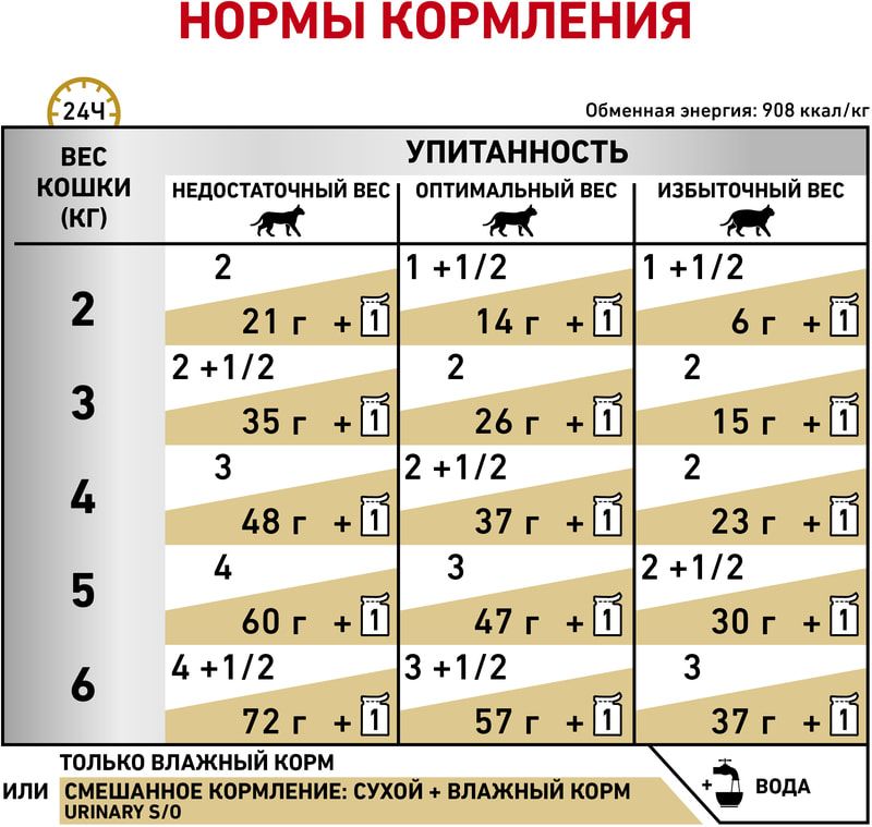 Рекомендации по кормлению: для растворения камней или исчезновения симптомов мочевой инфекции требуется применение диеты в течение 4-12 недель. В случае инфекции минимальный срок назначения рациона Urinary S/O Feline в комплексе с антибиотиком составляет еще минимум месяц после получения отрицательного бактериологического анализа мочи. Перед назначением пожилым животным корма Urinary S/O Feline необходимо убедиться в нормальном функционировании их почек.