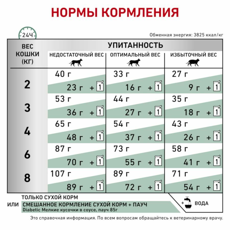 *Примечание: применение этого корма может оказать влияние на чувствительность кошки к инсулину. После достижения контроля гликемии диету выбирают на основании балльной оценки упитанности. BCS 6 или ниже: продолжают применение продукта DIABETIC BCS 7-8-9: переводят на продукт SATIETY WEIGHT MANAGEMENT. Для адаптации доз инсулина крайне рекомендуется в первое время после перевода кошки на диету измерять уровень глюкозы в крови и инсулиновую реакцию.