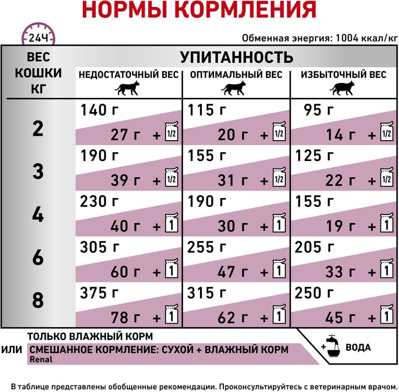 Рекомендации по кормлению: минимальный срок назначения диетотерапии составляет 6 месяцев. По истечении этого времени необходимо повторное общее обследование. Если повреждены 3/4 нефронов почек, болезнь приобретает необратимый характер, и диетотерапию назначают для применения в течение всей жизни кошки.