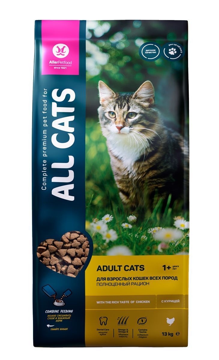 ALL CATS - это полнорационный премиальный корм для кошек всех пород. Он разработан на основе результатов последних исследований в области питания домашних животных, а также с учетом международных стандартов (AAFCO/FEDIAF). ALL CATS идеально подходит в качестве полноценного питания, поскольку содержит жизненно важные витамины и минералы. Жирные кислоты Омега-3 и Омега-6, содержащиеся в составе, необходимы для здоровой кожи и красивой шерсти. А хрустящие гранулы угловатой формы поддерживают гигиену полости рта. ALL CATS содержит аминокислоту таурин, которая помогает предотвратить дегенерацию сетчатки глаза, а также укрепляет иммунную систему кошки.