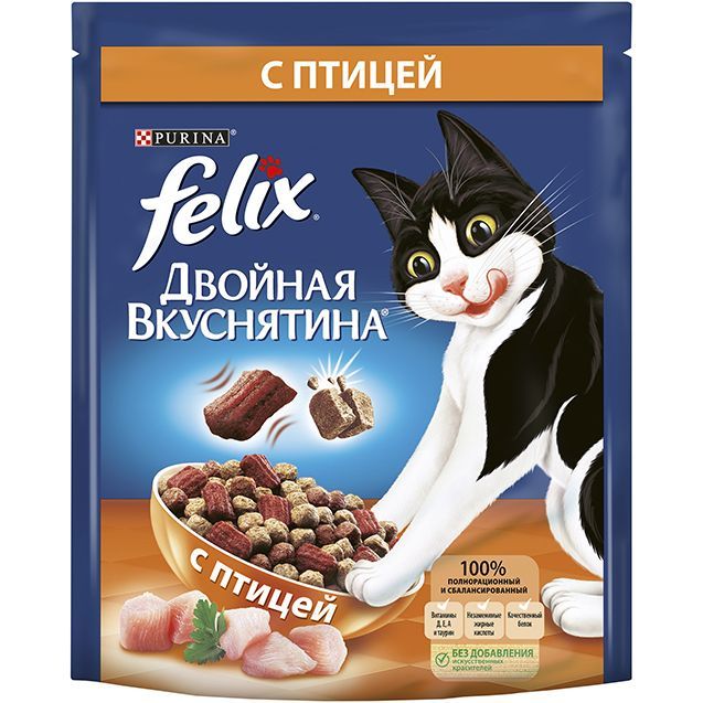 Felix Двойная Вкуснятина – новый сухой корм для кошек, который полностью соответствует потребностям вашего озорника. Восхитительное сочетание двух текстур в одной упаковке: хрустящие гранулы смешаны с мягкими кусочками для создания невероятного вкуса, перед которым невозможно устоять!