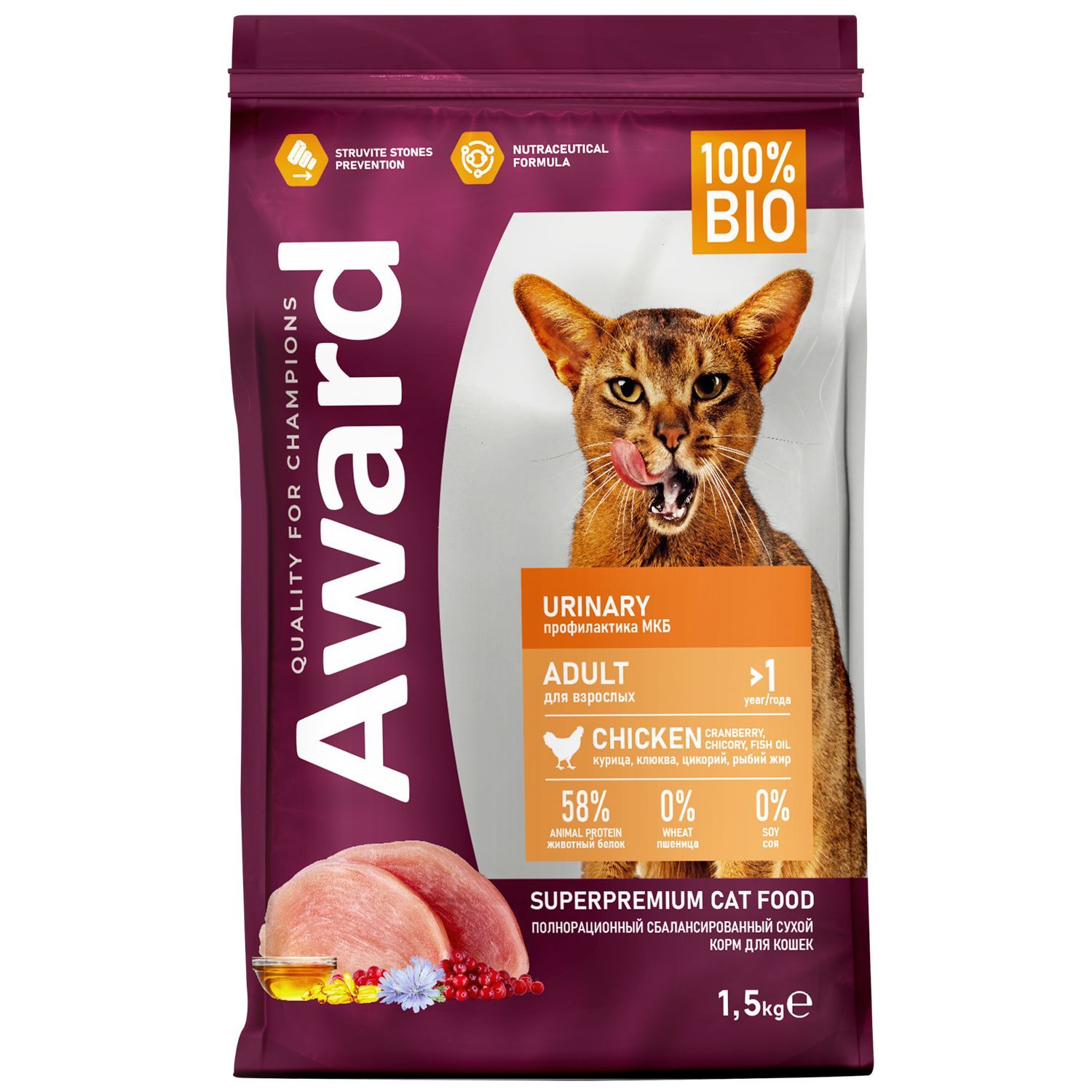 Сухой корм AWARD Urinary для взрослых кошек для профилактики мочекаменной болезни с курицей с добавлением клюквы, цикория и рыбьего жира 1,5 кг.
