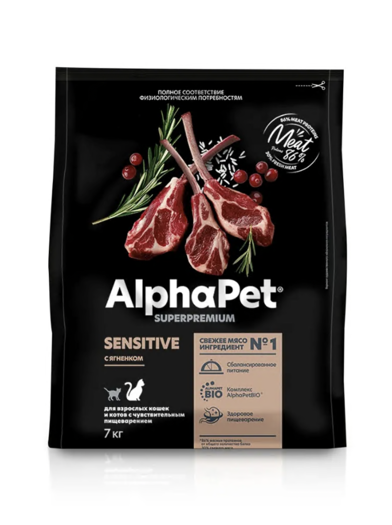 Корм для кошек AlphaPet Sensitive АльфаПет для чувствительного пищеварения с ягненком 7 кг сух. пакет**