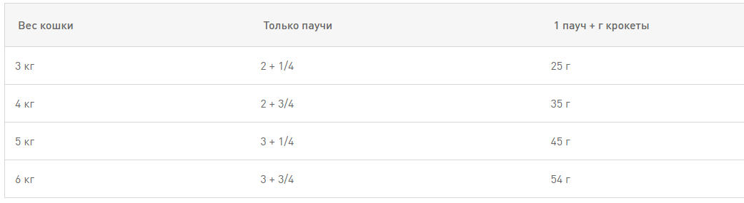Рекомендации по кормлению: см. таблицу. Корм готов к употреблению. Проследите, чтобы у вашей кошки всегда была свежая вода.