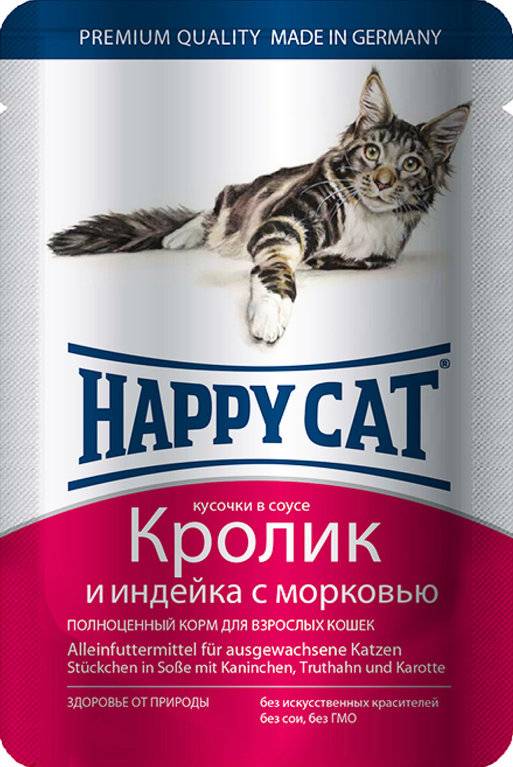 Полноценный корм Happy Cat кролик и индейка с морковью кусочки в соусе обеспечивает правильное и разнообразное питание кошки. Вкусный и натуральный корм содержит качественно отобранные ингредиенты, чтобы порадовать даже самую привередливую кошку.