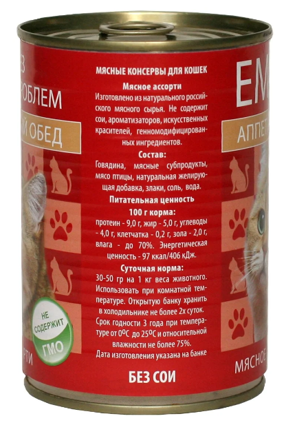 -Корм для кошек Ем без проблем Аппетитный обед конс. мясное ассорти 410 гр. ж/б