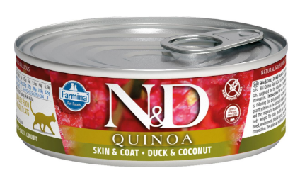 N&D Quinoa Skin & Coat - полнорационный диетический влажный корм для кошек, рекомендуемый для снижения пищевой непереносимости питательных веществ.