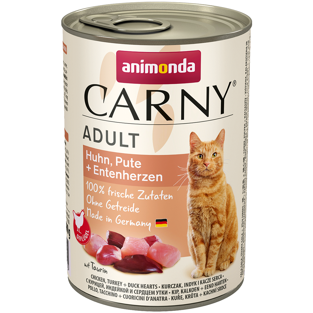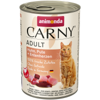 Консервы с курицей, индейкой и сердцем утки для кошек (Animonda Carny Adult Cat - Chicken, Turkey + Duck Hearts) − уникальные полнорационные корма супер-премиум класса для взрослых кошек.