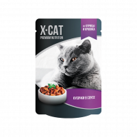 Корм консервированный полнорационный X-CAT для взрослых кошек. Кусочки в соусе из курицы и кролика.