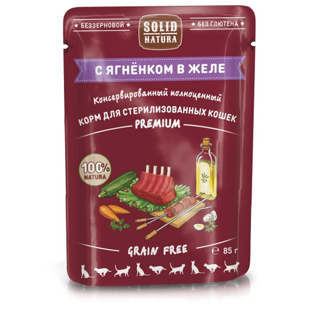 Корм для кошек Solid Natura Premium Grain Free Солид Натура Премиум беззерновой для стерилизованных с ягненком в желе 85 г пауч**