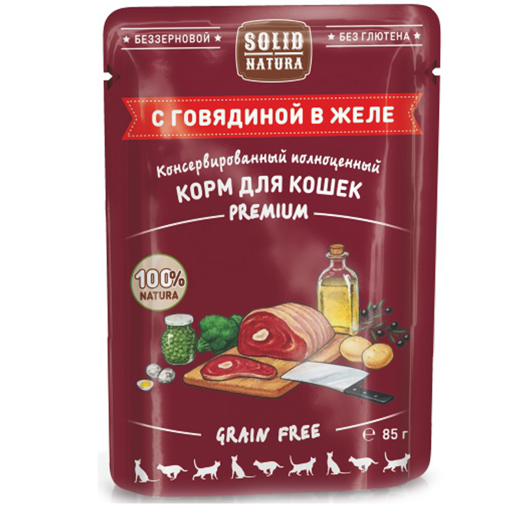 Корм для кошек Solid Natura Premium Grain Free Солид Натура Премиум беззерновой с говядиной в желе 85 г пауч**
