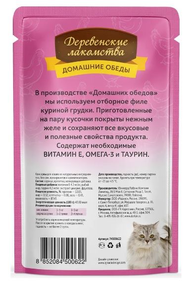 В производстве "Домашних обедов" используется отборное филе куриной грудки и креветок. Приготовленные на пару кусочки покрыты нежным желе и сохраняют все вкусовые и полезные свойства продукта. Содержат необходимые Витамин Е, Омега-3 и таурин.