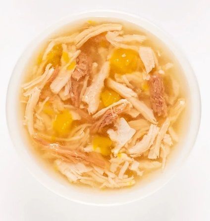Восхитительное лакомство для кошек в виде куриного супа с уткой и тыквой в густом аппетитном бульоне.