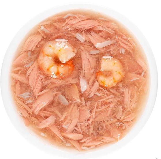 Аппетитное лакомство для кошек в виде супа с тунцом, креветкой и крабом в густом аппетитном бульоне.