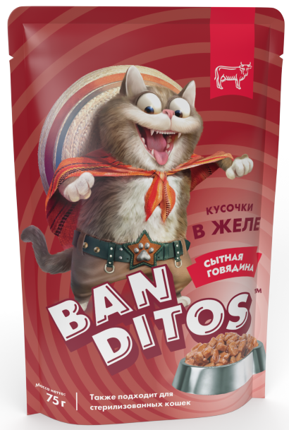 Корм для кошек Banditos Бандитос "Сытная говядина" кусочки в желе 75 г пауч**