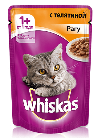 Консервированный корм Whiskas "Рагу с телятиной"- полнорационный корм эконом-класса, предназначенный для взрослых кошек с 1 года до 7 лет. В состав корма входят все питательные вещества,витамины и минералы,необходимые для сбалансированного питания Вашей кошки каждый день.Без красителей и консервантов.