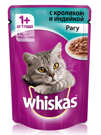 Консервированный корм Whiskas "Рагу с кроликом и индейкой"- полнорационный корм эконом-класса, предназначенный для взрослых кошек с 1 года до 7 лет. В состав корма входят все питательные вещества,витамины и минералы,необходимые для сбалансированного питания Вашей кошки каждый день.Без красителей и консервантов.