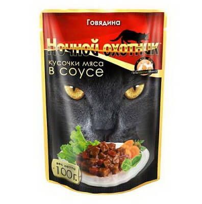Корм для кошек Ночной охотник влажный говядина кусочки мяса в соусе 100 гр. пауч