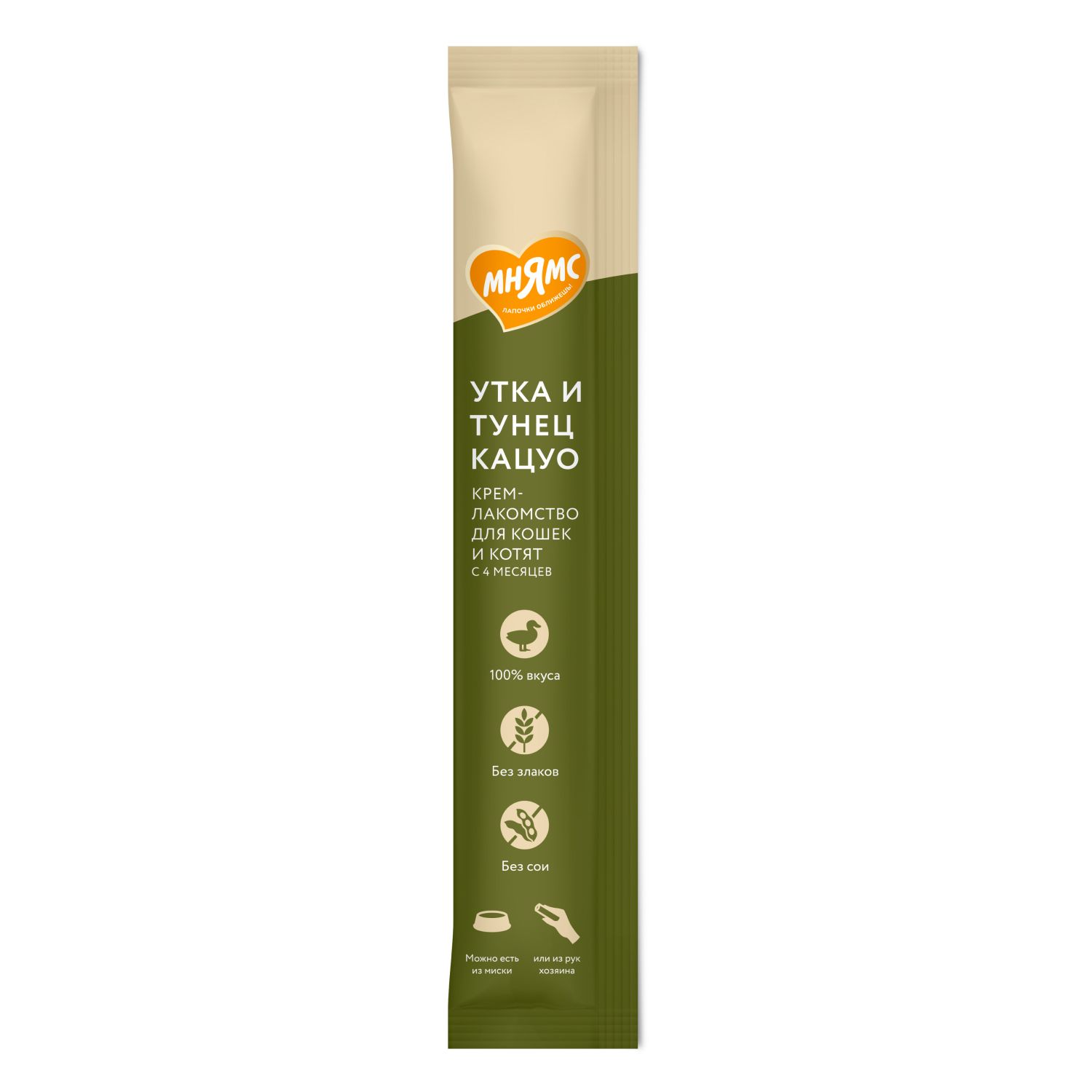 Крем-лакомство «Мнямс» с уткой и тунцом Кацуо – это излюбленное кошками угощение с нежнейшей кремовой текстурой.
