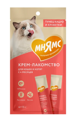 Крем-лакомство «Мнямс» с тунцом Кацуо и креветками – это излюбленное кошками угощение с нежнейшей кремовой текстурой. Идеальный баланс вкуса, полезных ингредиентов и высокого содержания влаги, так необходимого кошкам, дает возможность проявить любовь и получить благодарное лапопожатие взамен.