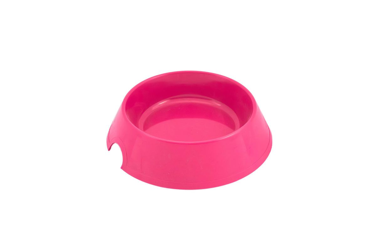 Миска для кошек из цветного первичного полипропилена, с декоративным обрамлением и полукруглым вырезом.