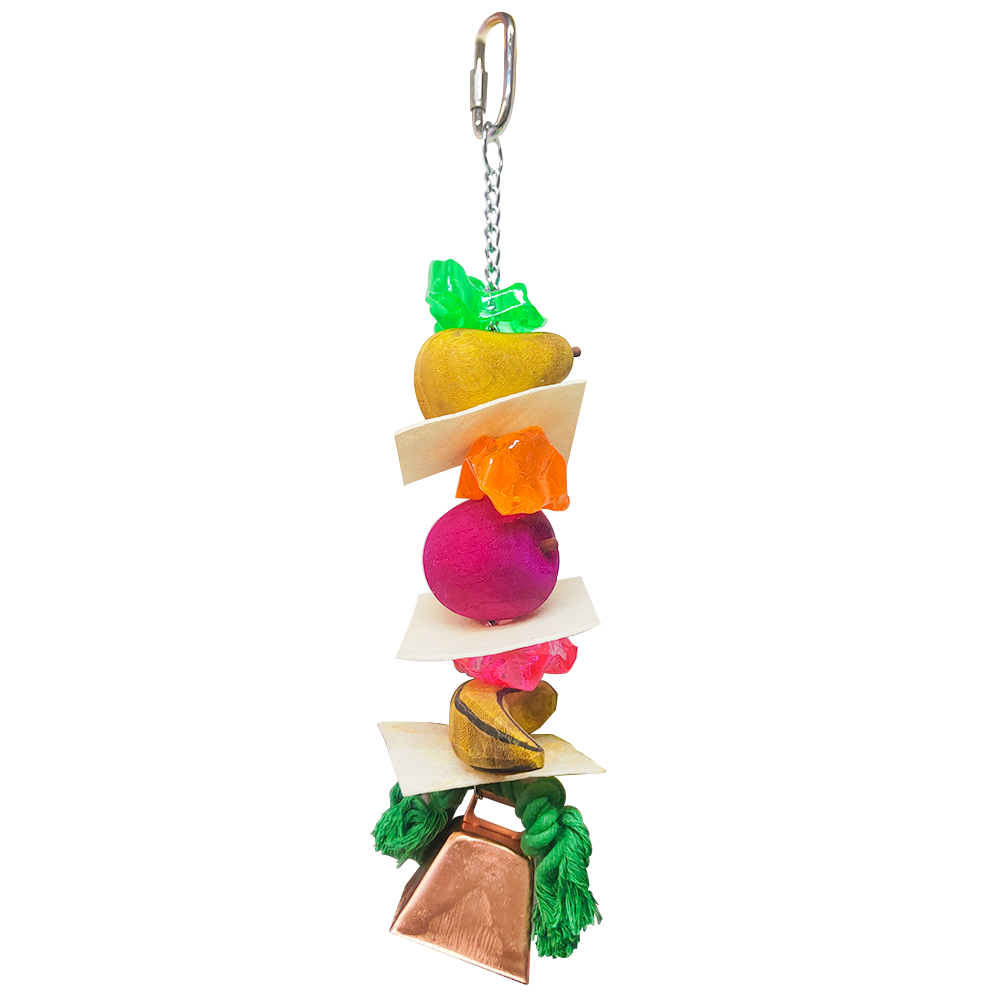 Яркая игрушка из деревянных элементов в виде разнообразных фруктов. Игрушка дополнена деталями из акрила, сыромятной кожи и колокольчиком.