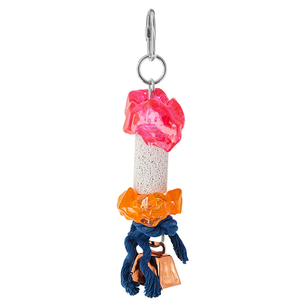 Игрушка-гирлянда с основным элементом из вулканического камня (пемза). Дополнена яркими деталями из акрила и узлов веревок, которые заинтересуют птицу.