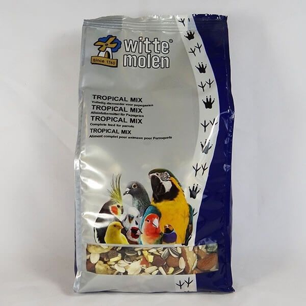 Корм для крупных попугаев тропическая смесь Witte Molen Tropical Mix For Parrots.Содержит семена подсолнечника, семена тыквы, грецкие орехи, миндаль и шиповник. Можно давать как основной корм, как лакомство и как дополнение к основному корму.