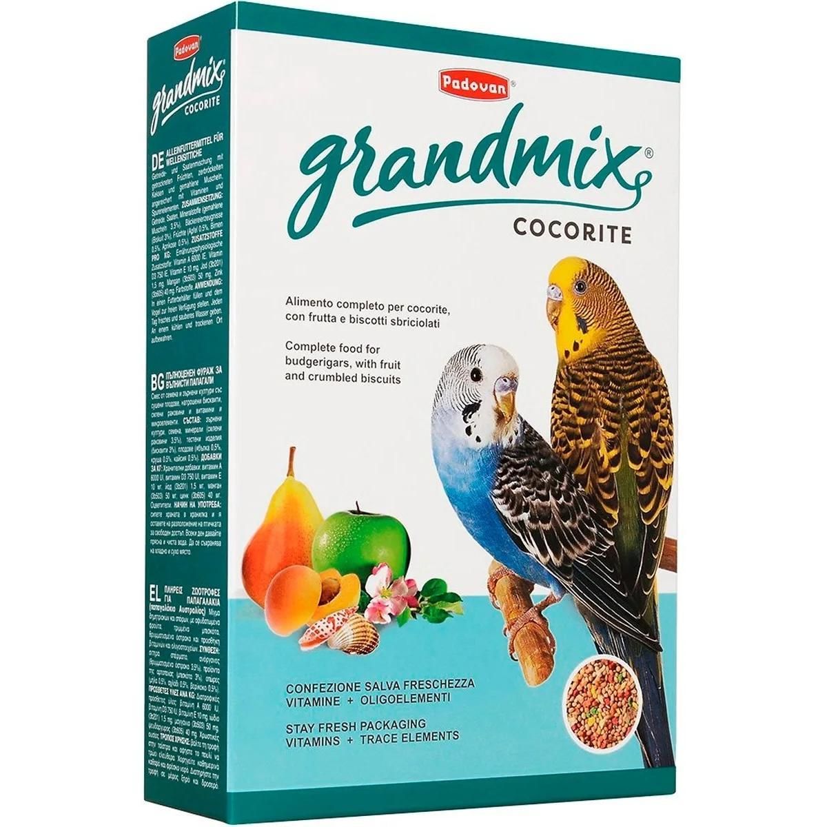 Комплексный корм Padovan Cocorite GrandMix для маленьких попугаев (волнистых попугаев) - высококачественный полноценный комплексный корм, обогащенный фруктами и бисквитной крошкой, с минеральными и витаминными добавками для маленьких (волнистых) попугаев.