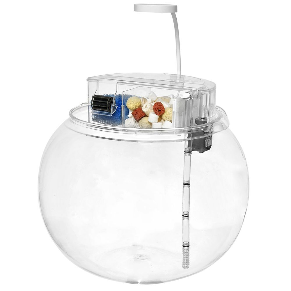 В набор входит: аквариум-шар (пластиковый) объемом 10л, фильтр 4Вт, наполнители для фильтра (губка и керамические кольца) и светильник, работающий от USB адаптера, а также аэратор-мельница.