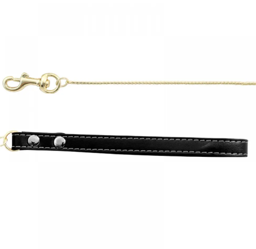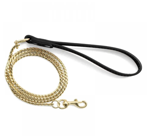 Изящный поводок-цепь золотистого цвета с удобной кожаной ручкой - идеальный вариант для питомцев с выставочной карьерой. Аккуратное плетение из мелких звеньев не ломает линию шеи и обеспечивает максимальное скольжение по шерсти животного, не допуская ее преминания, сечения и запутывания. Изделие отлично смотрится и подходит для собак мелких и средних пород.