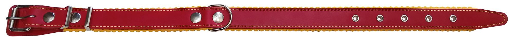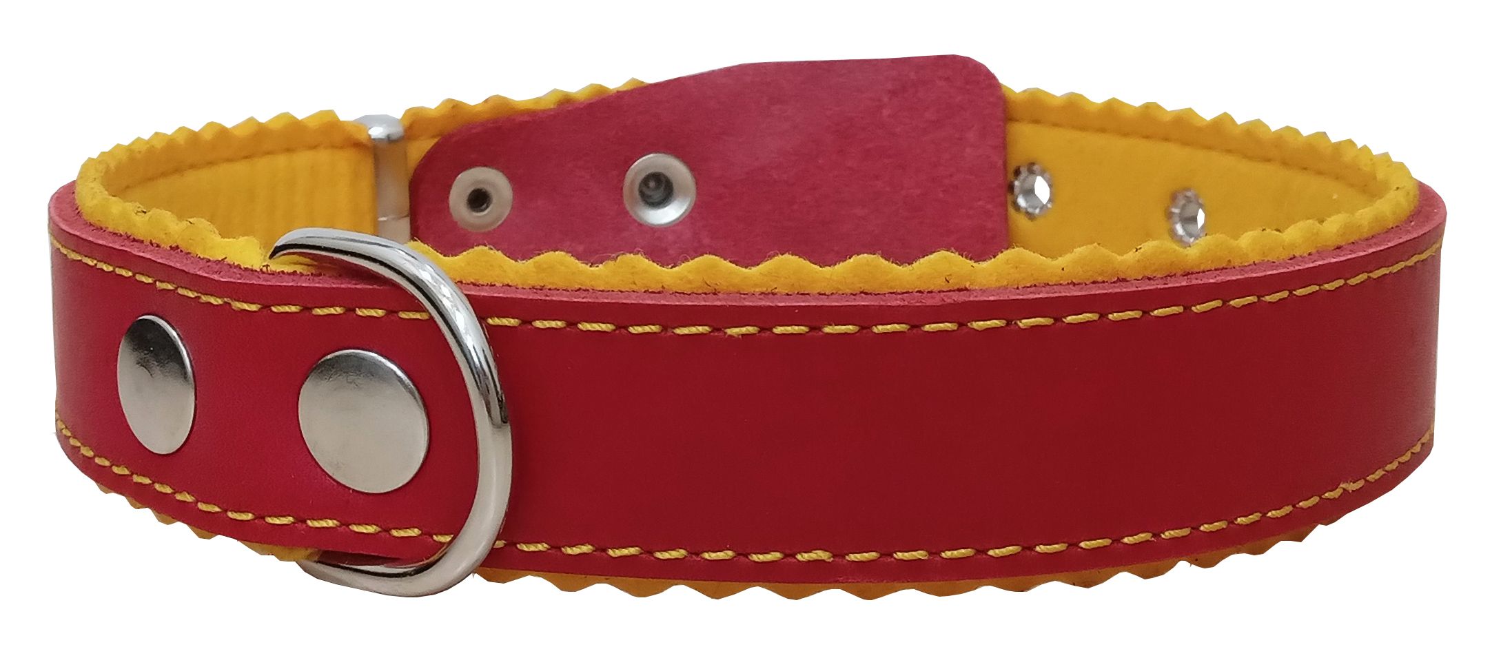 Однослойный ошейник из натуральной кожи, подшитый фетром, украшенный декоративными зубчиками и строчкой с полукольцом посередине.