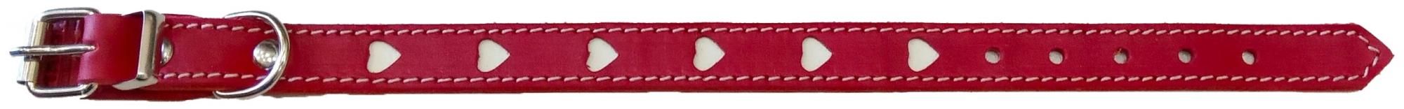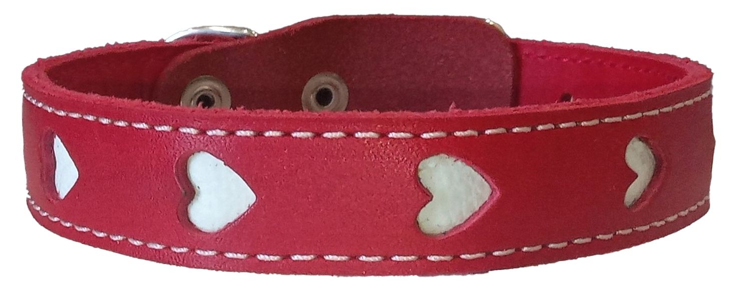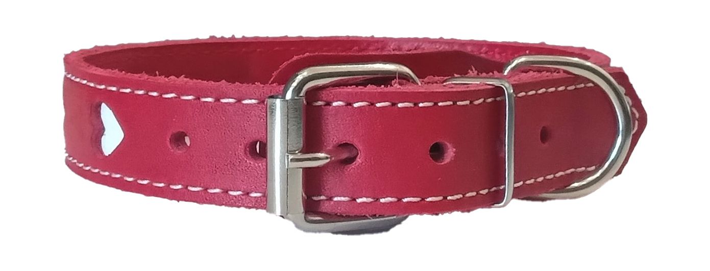 Ошейник из 2 слоев натуральной кожи, верхний слой украшен декоративной высечкой в форме сердечек. Прошит декоративной строчкой, проклеен, полукольцо у пряжки.