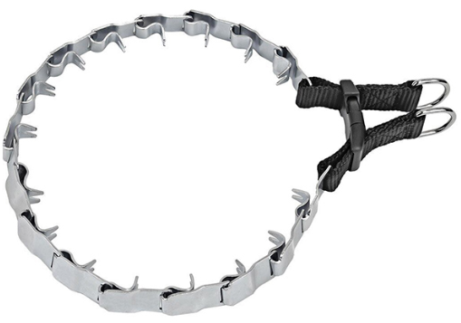 Ошейник из металлических пластин с загнутыми со стороны шеи собаки шипами. Крайние звенья крепятся к стропам и закрепляются на фастекс