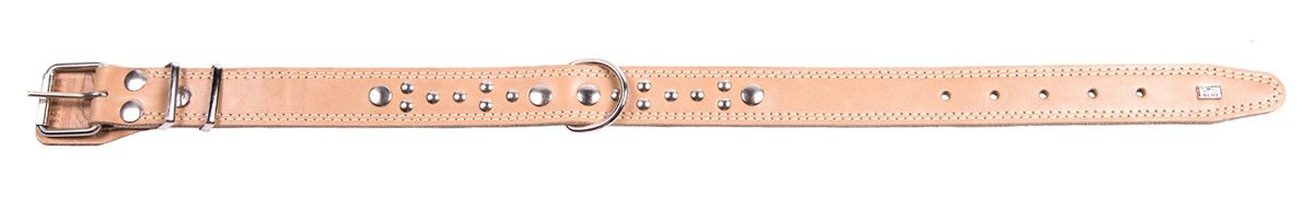 Двухслойный ошейник из натуральной кожи, украшенный металлическими заклепками, проклеен, прошит декоративной строчкой, полукольцо посередине.