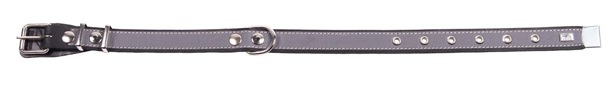 Однослойный ошейник из натуральной кожи со светоотражающей полосой, прошит декоративной строчкой, снабжен металлическим наконечником, отверстия укреплены металлической блочкой, полукольцо посередине.