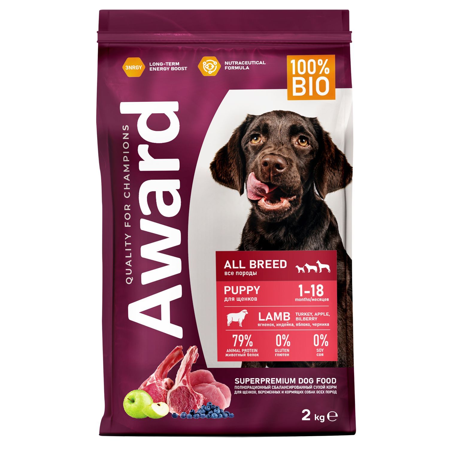 Сухой корм AWARD для щенков от 1 месяца, беременных и кормящих сук всех пород с ягненком и индейкой с добавлением яблока и черники 2 кг.