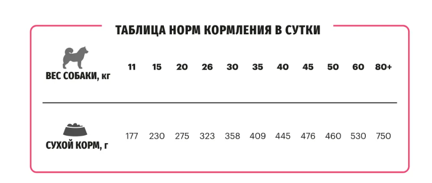 Рекомендации по кормлению: используйте таблицу на упаковке для определения суточной нормы кормления вашей собаки. Указанные нормы рекомендованы для поддержания питомца в оптимальной физической форме. Индивидуальные потребности в питании могут отличаться в зависимости от размера, возраста и уровня активности животного. Данные предписания носят исключительно рекомендательный характер. Для достижения оптимального состояния животного может потребоваться изменение рациона. Переход на новый корм должен происходить в течение недели или более. Всегда оставляйте постоянный доступ к чистой питьевой воде.